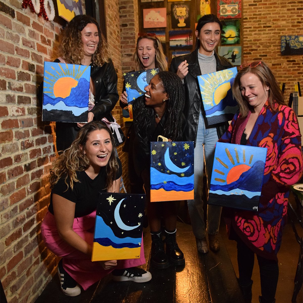 Throw a party in one of our private rooms. Our venue can accommodate your needs whether you have a small private party or a large group. We’ll guide you step-by-step through the painting of your choice while you enjoy wine, beer, and bar bites to inspire your inner artist. When you’re done, your masterpiece is yours to keep.