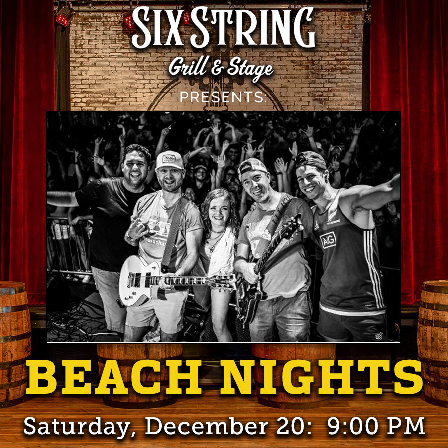Saturday, December 20, 2025: 9:00 PM Join us for a live set from Beach Nights on the Six String stage! Cover charge and 21+ with valid ID starting at 8:30 pm. Stay