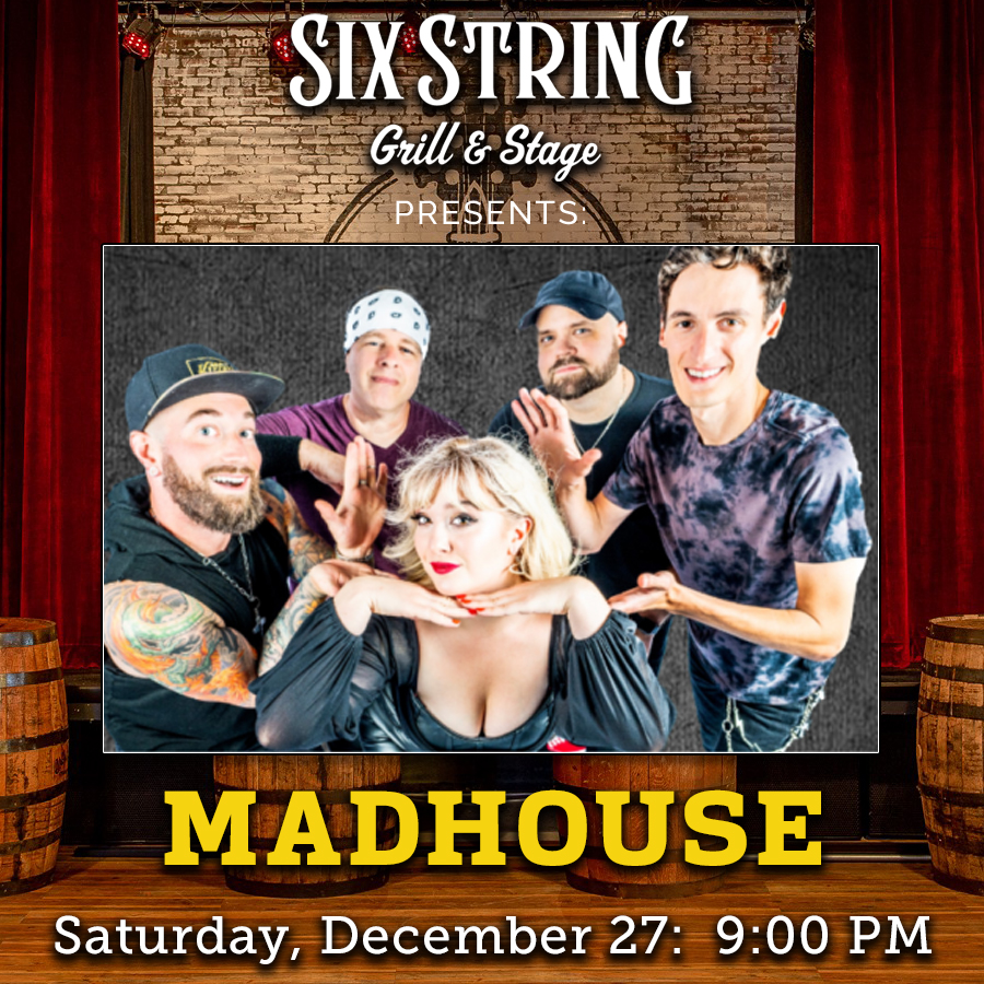 Saturday, December 27, 2025: 9:00 PM Join us for a live set from Madhouse on the Six String stage! Cover charge and 21+ with valid ID starting at 8:30 PM. Stay updated with