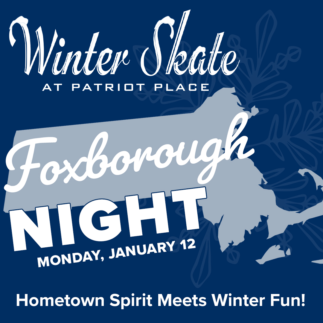 Get ready to show your Foxboro pride! Wear your Navy, Gold, and White Foxboro gear toย Winterย Skateย and receive FREE admission for a future visit! Plus, the first (20) guests representing their town will receive a special thank you from Patriot Place.