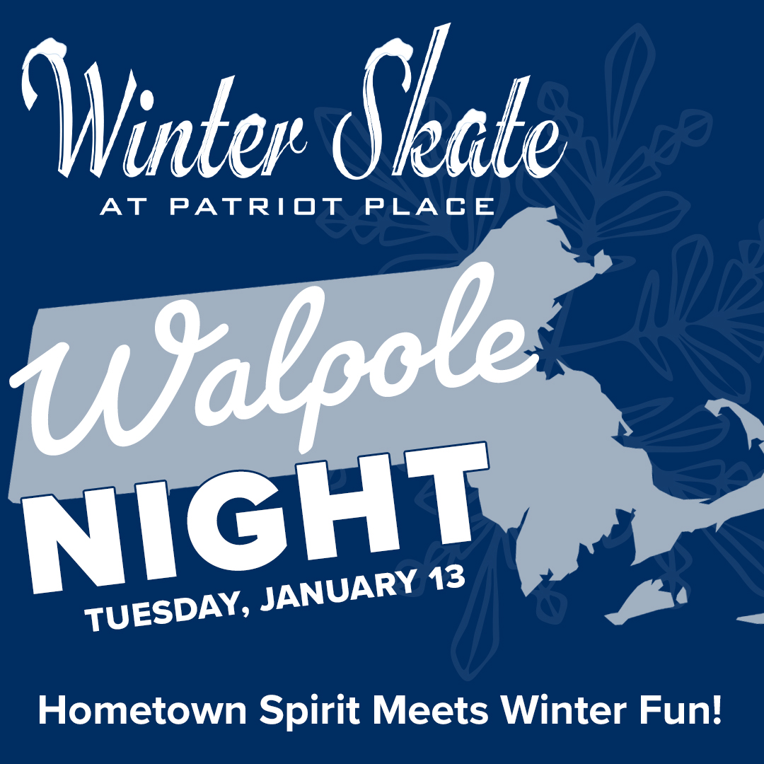 Get ready to show your Walpole pride! Wear your Blue & Orange Walpole gear to Winter Skate and receive FREE admission for a future visit! Plus, the first (20) guests representing their town will receive a special thank you from Patriot Place.
