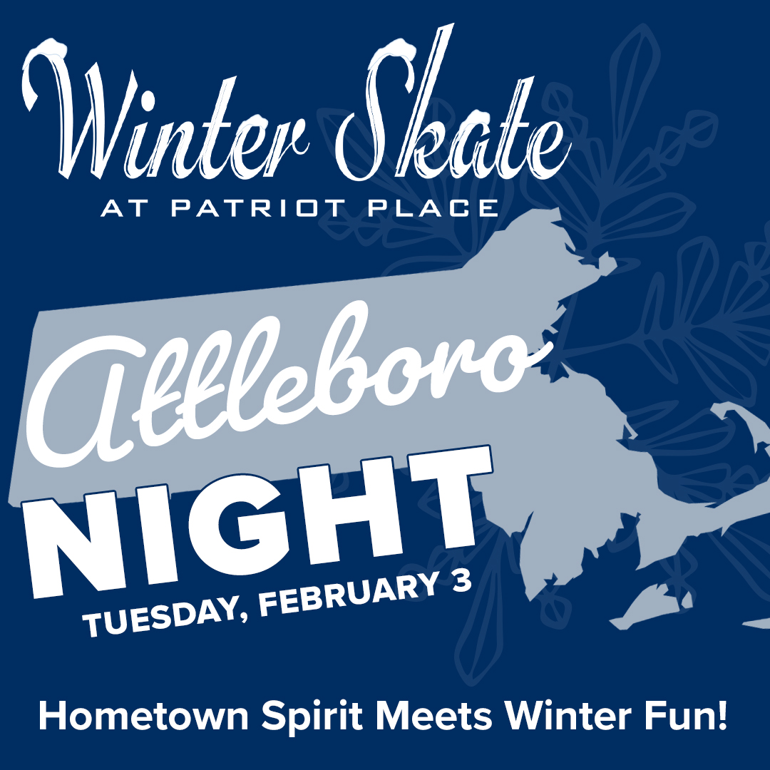 Get ready to show your Attleboro pride! Wear your Blue, Silver, and White Attleboro gear to Winter Skate and receive FREE admission for a future visit! Plus, the first (20) guests representing their town will receive a special thank you from Patriot Place.
