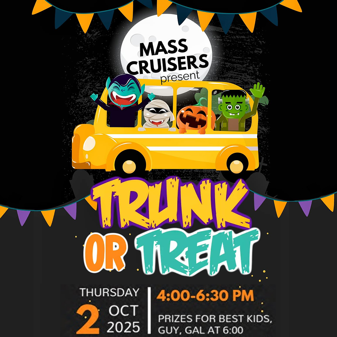 Thursday, October 2, 2025: 4:00 PM Join the Mass Cruisers Auto Club for free and exciting Cruise Night! It’s our annual Trunk or Treat Halloween event on October 2nd from 4:00 PM