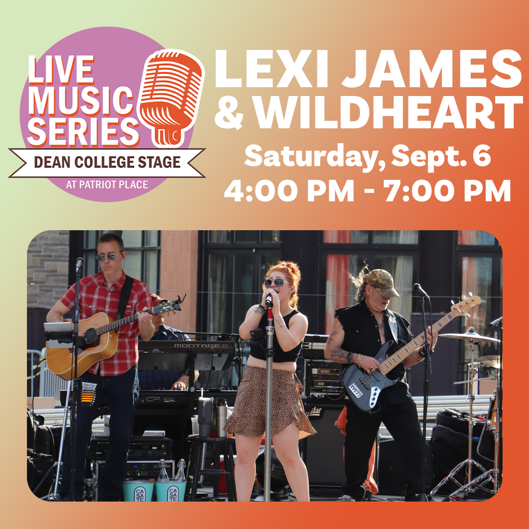 Welcome to the Live Music Series on the Dean College Stage at Patriot Place! Enjoy an afternoon of great tunes and good vibes with a live performance by Lexi James & Wildheart from 4 PM – 7 PM.