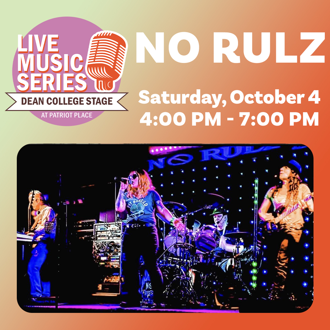Welcome to the Live Music Series on the Dean College Stage at Patriot Place! Enjoy an afternoon of great tunes and good vibes with a live performance by No Rulz from 4 PM – 7 PM.