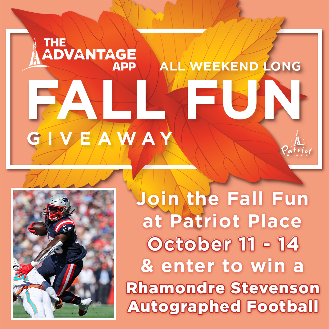 Visit Patriot Place this holiday weekend October 11 – 14 and enter to win a Rhamondre Stevenson autographed Patriots football when you check-in on the Patriot Place Advantage App!