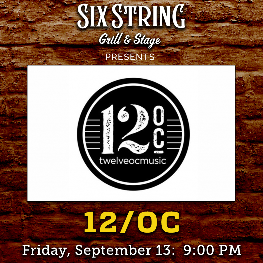 Friday, September 13, 2024 9:00 PM Join us for a live set from 12/OC on the Six String stage! Cover charge and 21+ with valid ID starting at 8:30 PM. Stay updated
