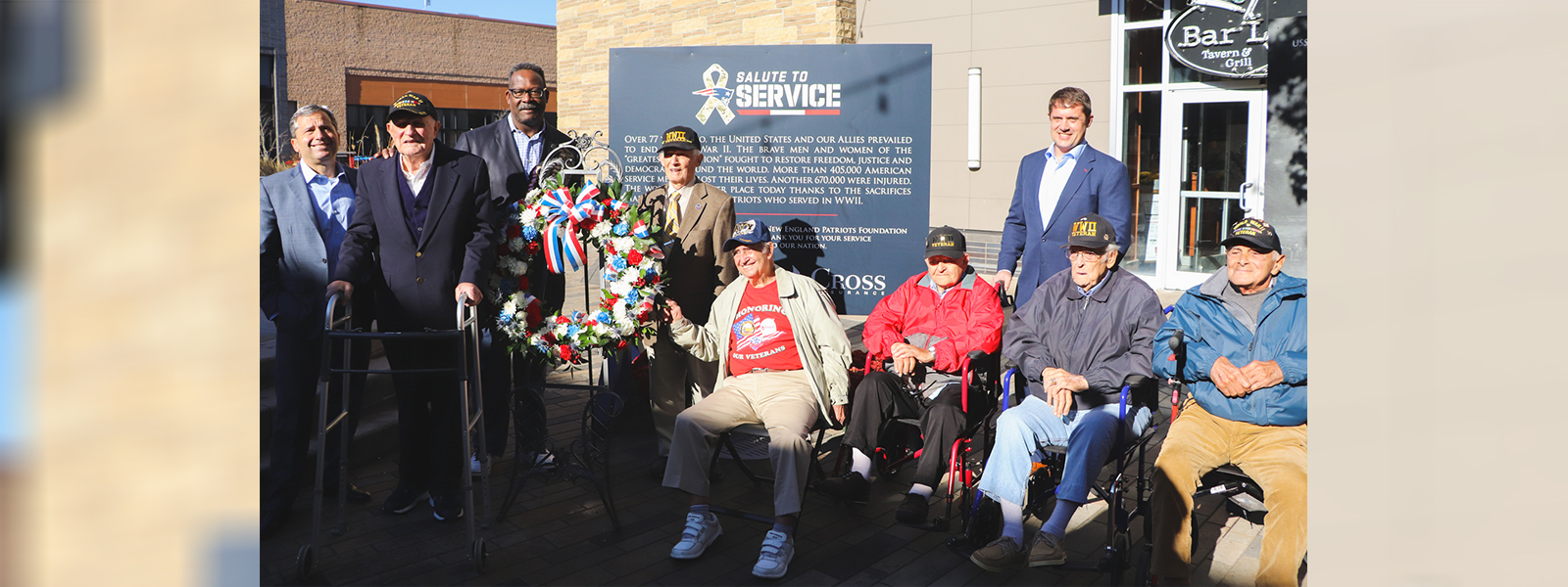 November 2, 2022 – Earlier today, as part of the NFL’s Salute to Service campaign, the Kraft family, the New England Patriots Foundation and Cross Insurance celebrated the “greatest generation with a special ceremony on Wednesday, Nov. 2, 2022, featuring a World War II memorial dedicated to the veterans who served in the war. The memorial will be on display at Patriot Place at the Dean College Stage through November 14.